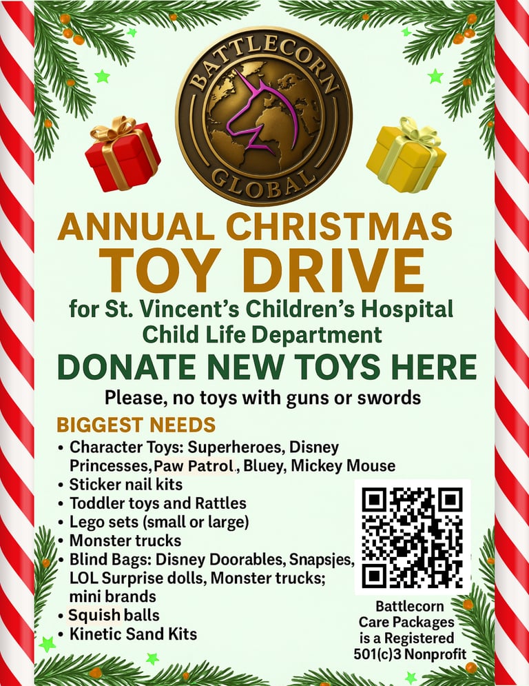 Host one of our Toy Drop Boxes at your Business or place of employment (email cvallier@battlecornglobal.org for details.